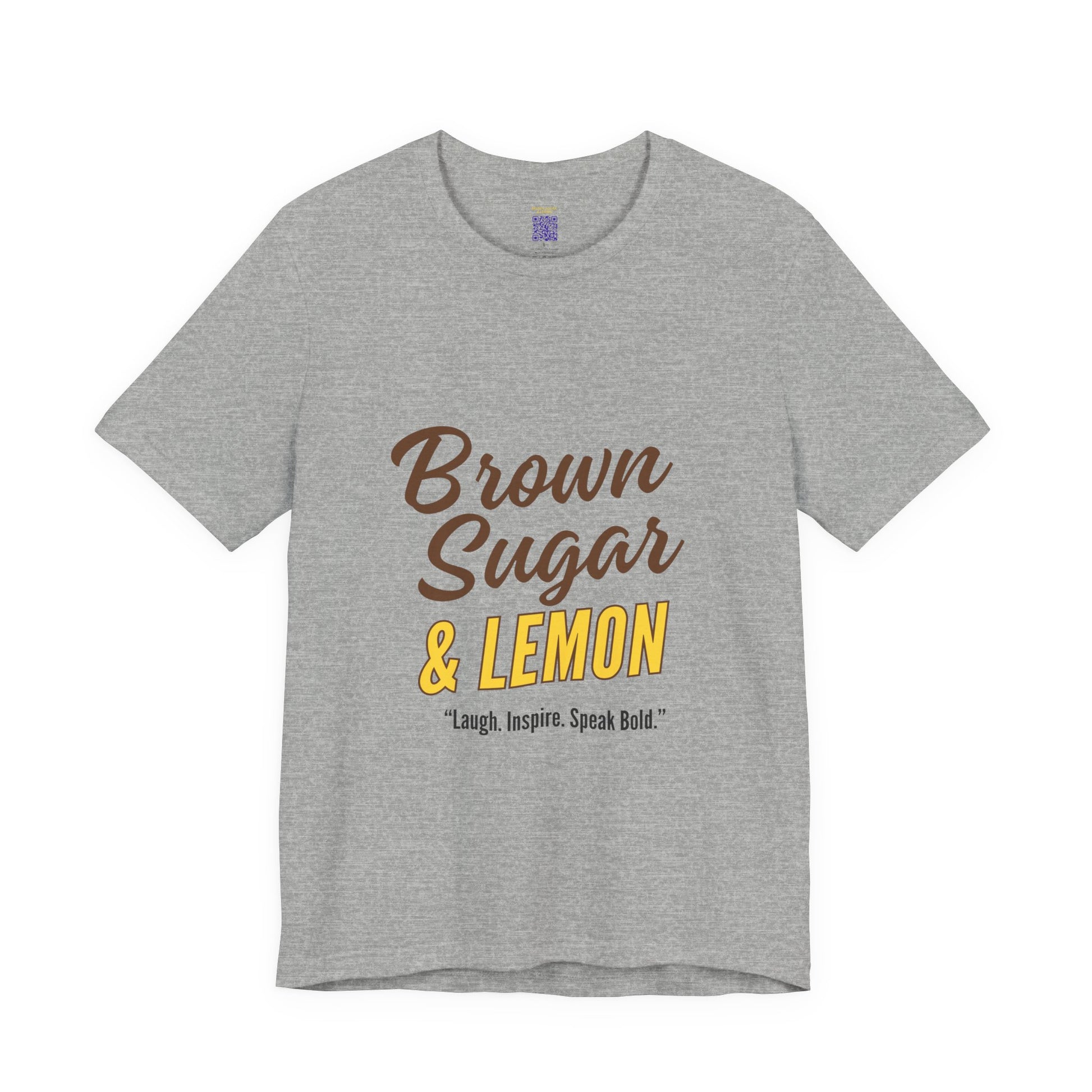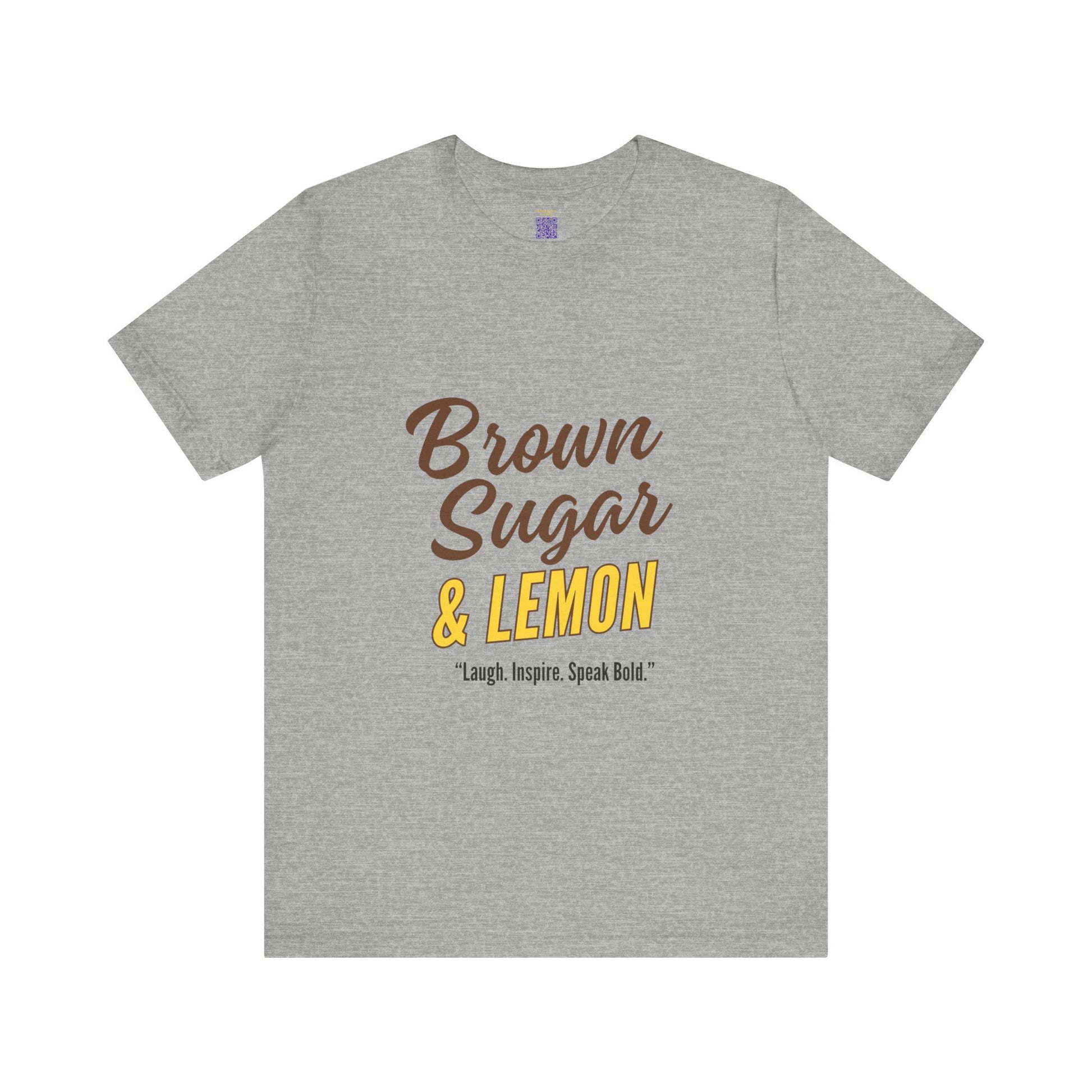 A unisex tee featuring the brand logo "Brown Sugar and Lemon" in a multicolor mixed font, giving off a bold, inspiring, funny vibe. Perfect for those looking to express their unique identity and sense of humor. Ideal for casual wear, layering, or as a statement piece. Relevant for brand fans, casual fashion enthusiasts, and those who appreciate bold designs. Suitable for everyday wear, as well as special occasions like casual Fridays, parties, and brand events.