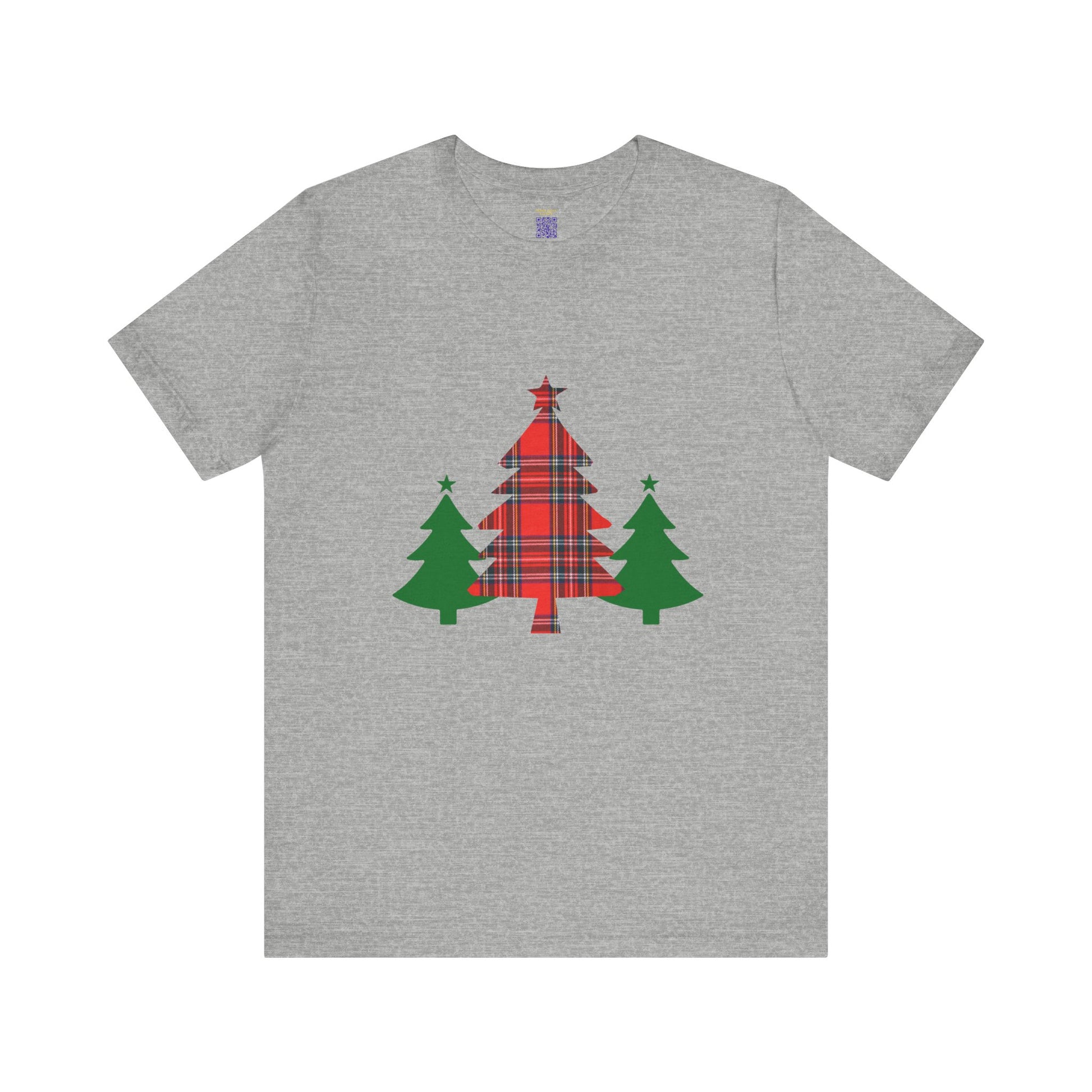 A festive Christmas tree-themed t-shirt featuring a large red tartan plaid Christmas tree in the center with two green Christmas trees on each side. Perfect for spreading holiday cheer and adding a touch of Christmas spirit to any outfit. Ideal for adults looking for a comfortable and stylish shirt for casual and semi-formal occasions during the holiday season.