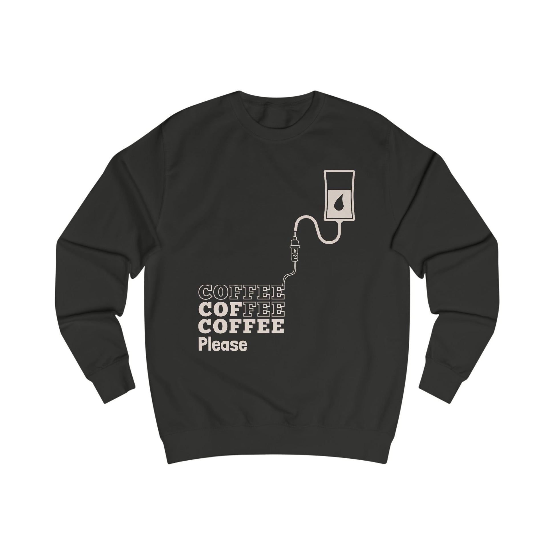 A black sweatshirt for relentless coffee lovers/addicts. They need their fix in the morning, however afternon and evening are open options as well.This cozy and durable sweatshirt is perfect for colder months, offering a classic fit and clean-cut style. Ideal for adults who enjoy coffee and want to stay warm in style. Relevant for casual wear, gift-giving occasions like birthdays or holidays.