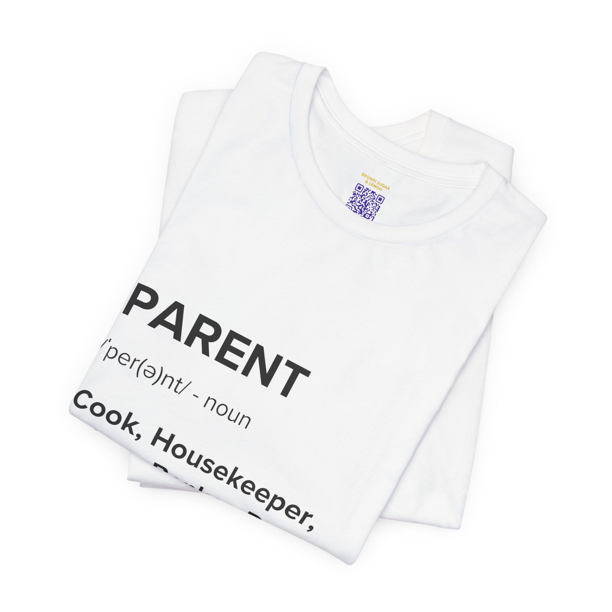 This white T-shirt features a funny and accurate dictionary-like definition of a parent, listing various roles such as banker, doctor, stylist, driver, and cook. The tee is made from 100% ring-spun cotton, offering a lightweight and comfortable feel. It is perfect for those looking for a humorous and relatable piece to wear in their everyday life. Ideal for parents, this T-shirt can be a great gift for Mother's Day, Father's Day, birthdays, or any occasion where a parent's hard work is celebrated.