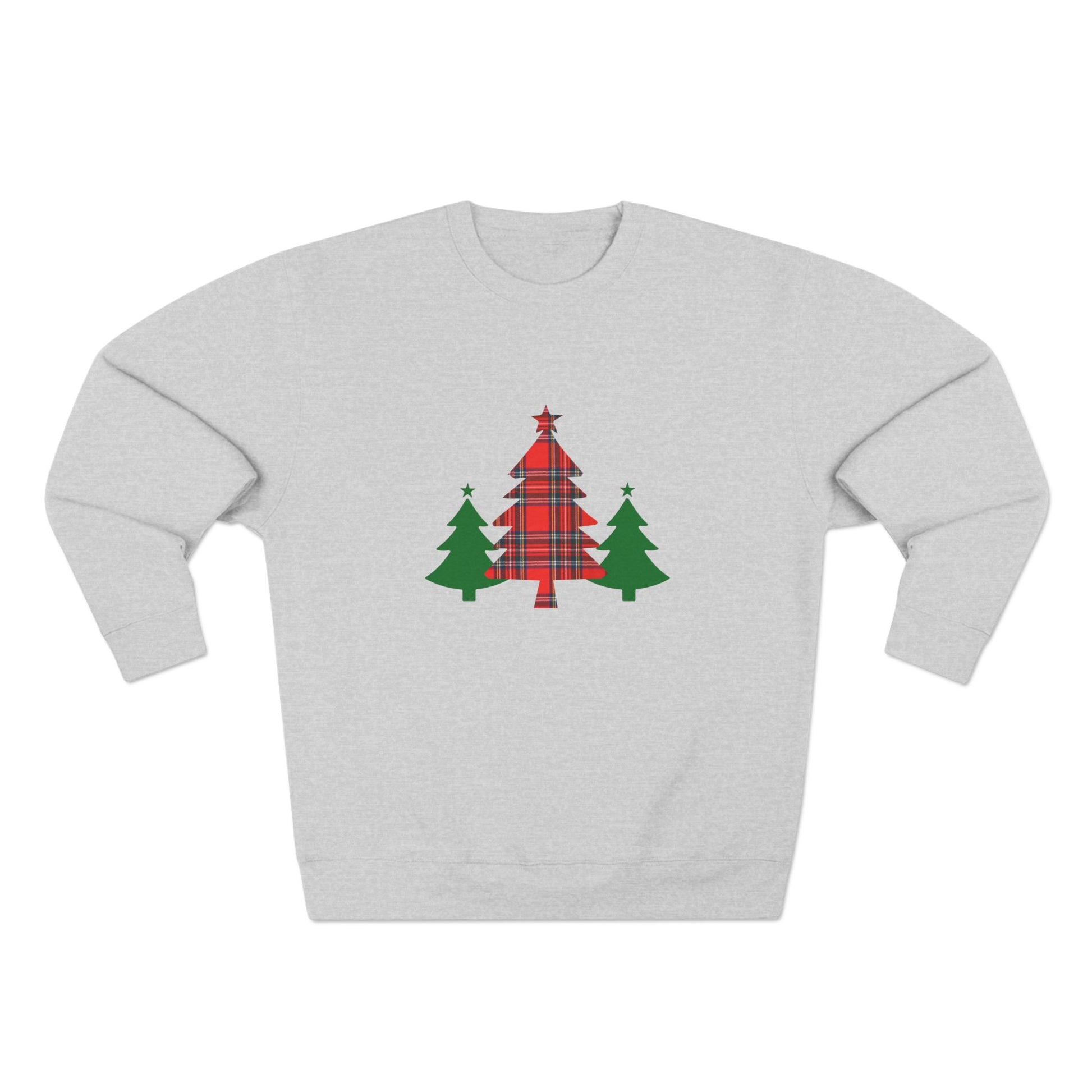 Cozy up in this unisex Gray sweatshirt featuring a red tartan plaid Christmas tree with 2 green Christmas trees to match. Perfect for the holiday season, this sweatshirt provides a festive and cozy vibe, making it ideal for those cold winter months. The classic fit and comfortable crew neckline offer a clean-cut style for anyone looking to stay warm and stylish during the holidays.